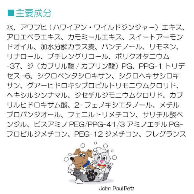 水、アワプヒ(ハワイアン・ワイルドジンジャー)エキス、アロエベラエキス、スイートアーモンドオイル、カモミールエキス、加水分解カラス麦、パンテノール、リモネン、リナロール、クエン酸、グリセリン、塩化ナトリウム、ブチレングリコール、フェノキシエタノール、ラウレス硫酸ナトリウム、コカミドMIPA、コカミドプロピルベタイン、トリメチルシロキシアモジメチコン、クラーヒドロキシプロピルトリモニウムクロリド、ヘキシルシンナマル、硝酸Mg、塩化Mg、サリチル酸ベンジル、メチルクロロイソチアゾリノン、メチルイソチアゾリノン、パレスー7&9、トリデセス-12、ビスアミノPEG/PPG-41/3アミノエチルPG-プロピルジメチコン、PEG-12ジメチコン、フレグランス