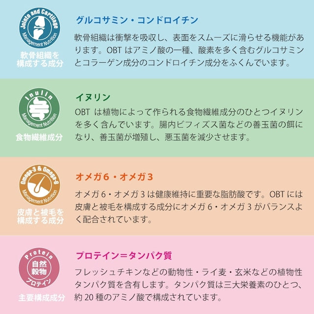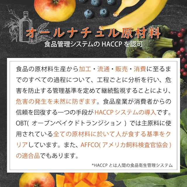 OBTでは主原料に使用されている全ての原材料に於いて人が食する基準をクリアしています。もちろん、AFFCO(アメリカ飼料検査官協会)の適合品でもあります。